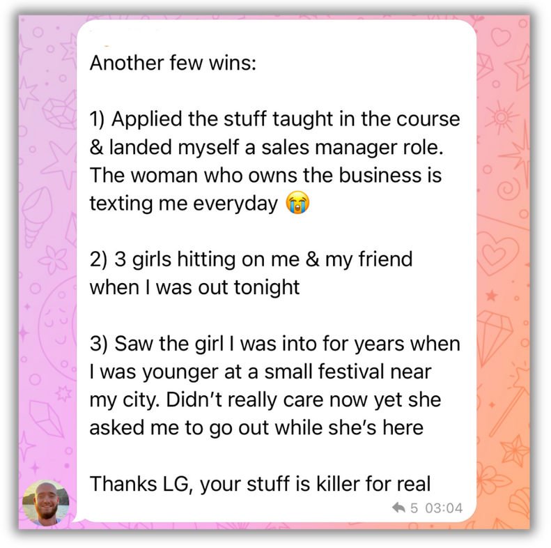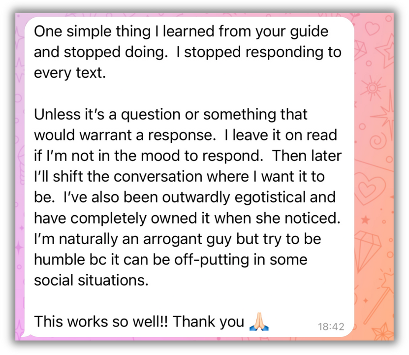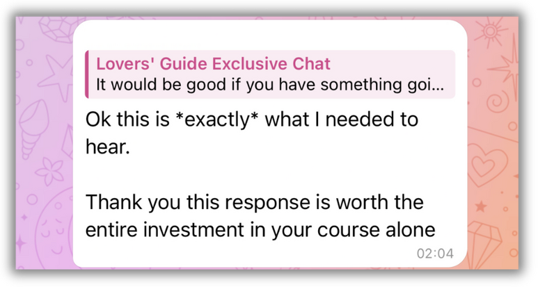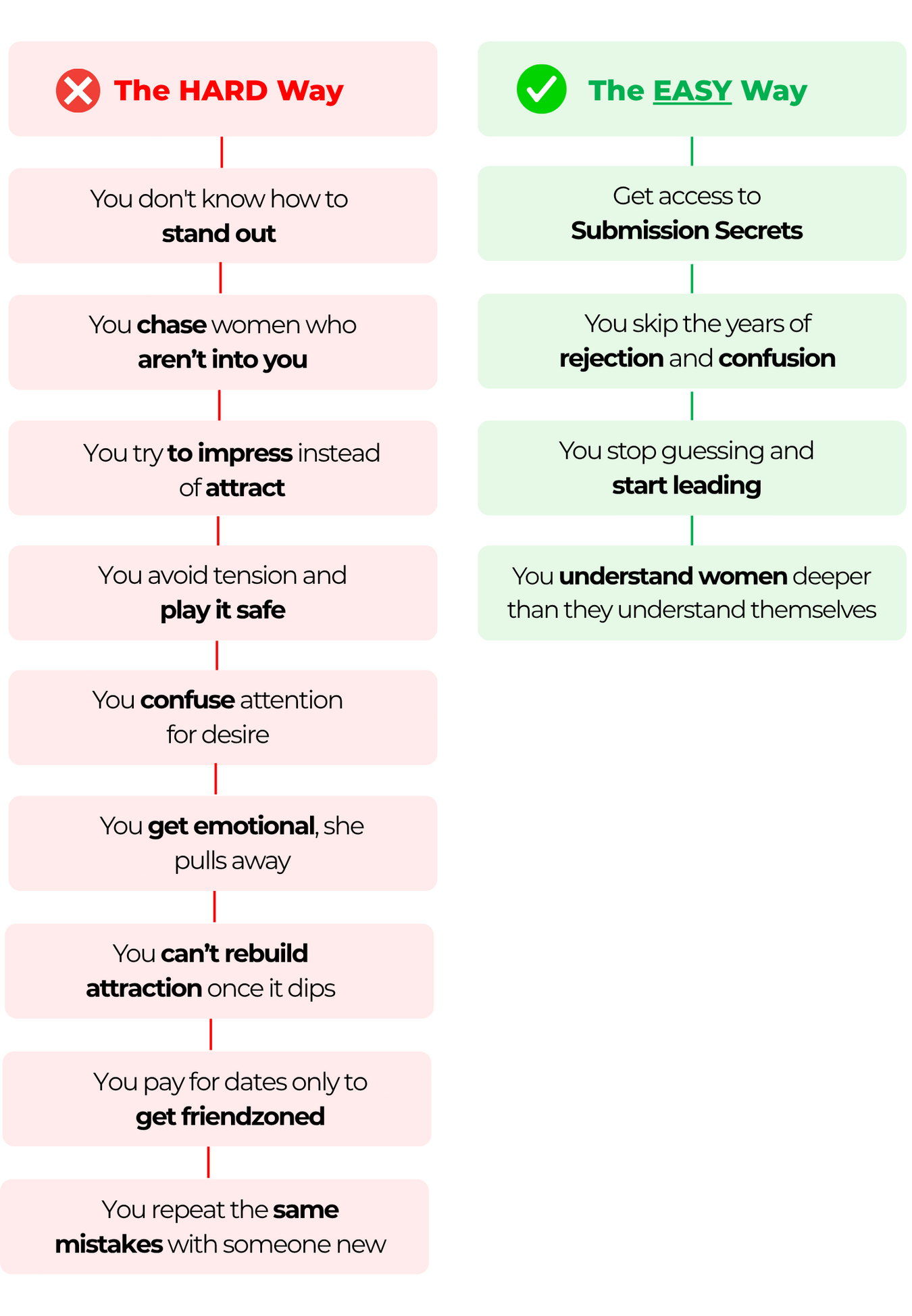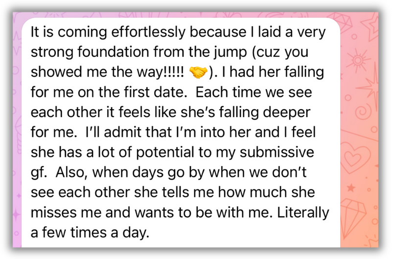 I’m so certain that this course will help you become a more confident, attractive, and successful man in your dating life that I’m offering you my "lifetime satisfaction handshake" guarantee,(that's unparalleled in this industry)If you go thru all the materials, ask questions in the group chat, and try your best...And still somehow manage to not fix your dating problems.I will personally work with you 1-on-1 until you land at least 10 new dates.OR until you see real, life-changing improvement and success with women…If I have to, I’ll even text and arrange dates myself — I’m that committed to your success.Makes sense?Remember, I'm taking all the risk.No Hassle. No Gimmicks, No Tricks.Your investment in Submission Secrets is not a purchase, it’s a partnership.You have nothing to lose.I wouldn’t dare offer this unless I was certain my course will work for you.