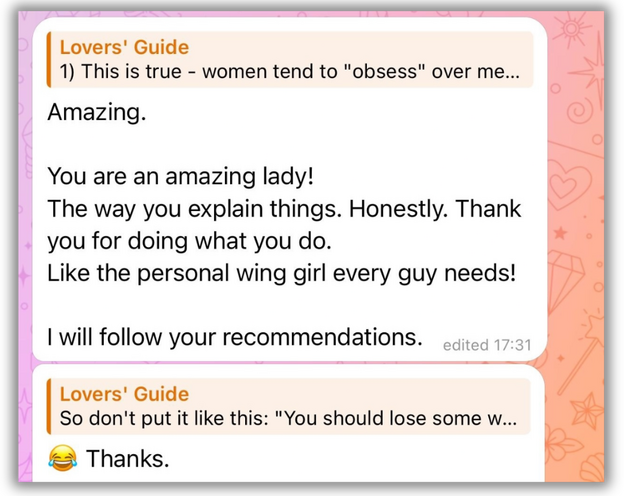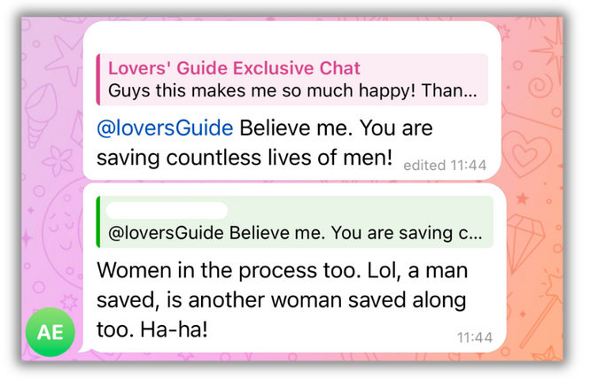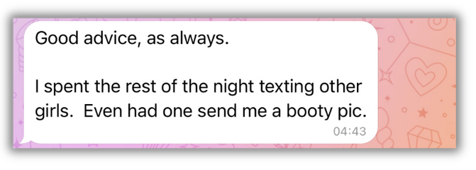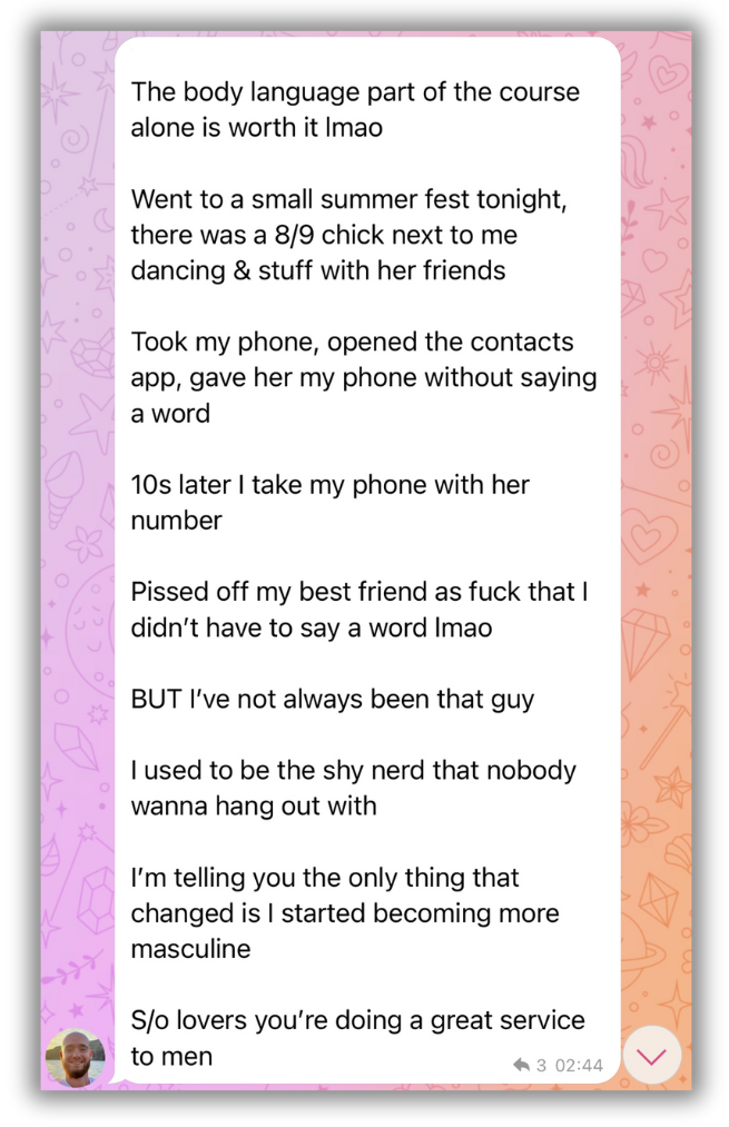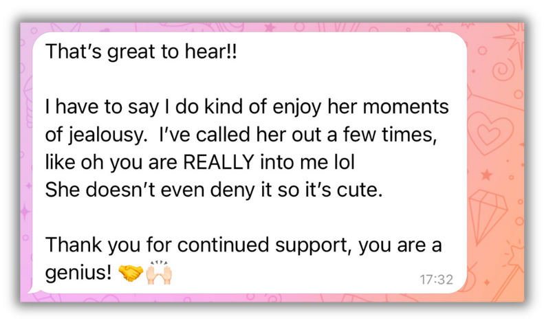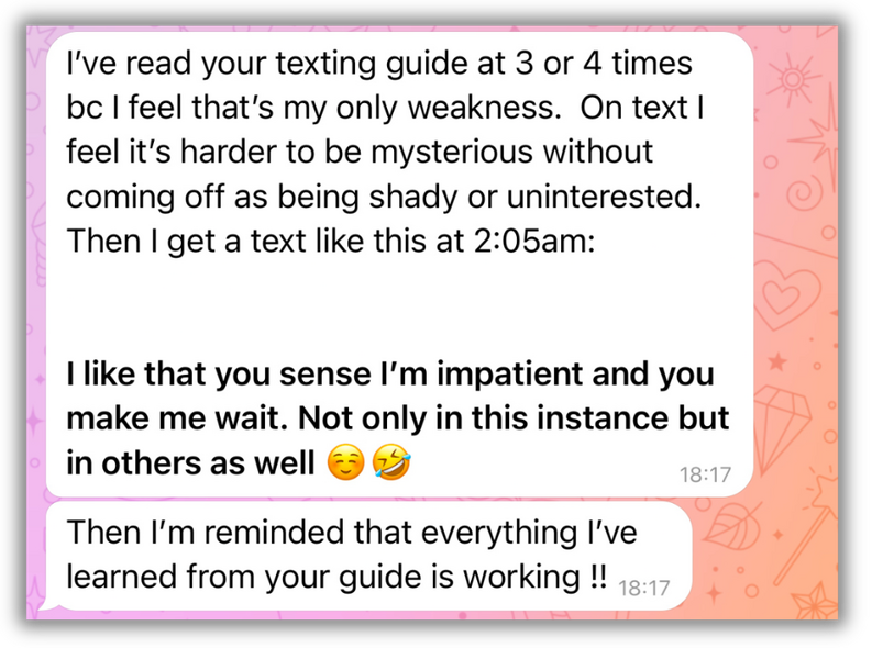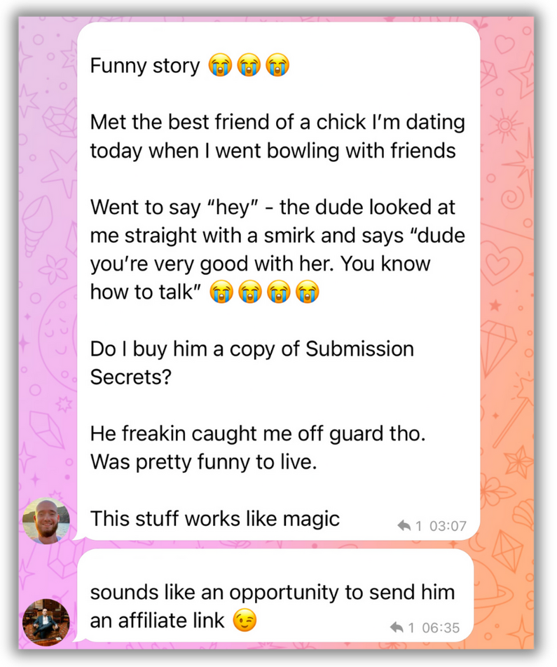 I’m so certain that this course will help you become a more confident, attractive, and successful man in your dating life that I’m offering you my "lifetime satisfaction handshake" guarantee,(that's unparalleled in this industry)If you go thru all the materials, ask questions in the group chat, and try your best...And still somehow manage to not fix your dating problems.I will personally work with you 1-on-1 until you land at least 10 new dates.OR until you see real, life-changing improvement and success with women…If I have to, I’ll even text and arrange dates myself — I’m that committed to your success.Makes sense?Remember, I'm taking all the risk.No Hassle. No Gimmicks, No Tricks.Your investment in Submission Secrets is not a purchase, it’s a partnership.You have nothing to lose.I wouldn’t dare offer this unless I was certain my course will work for you.